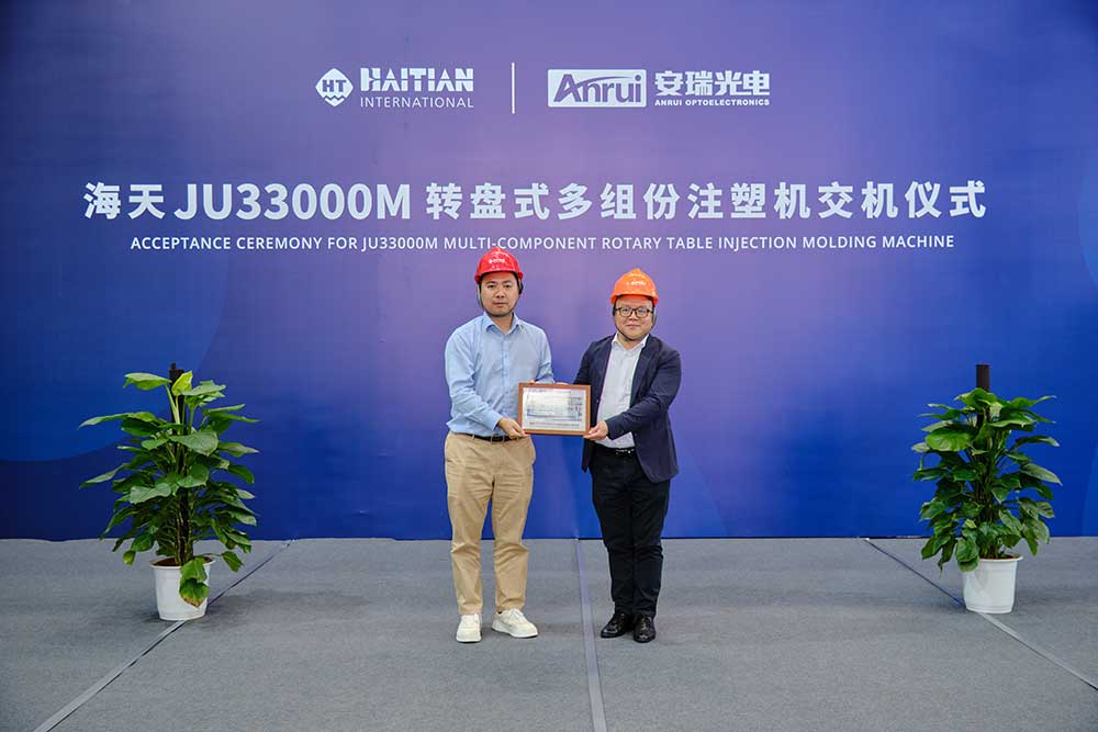 During the event, leaders from both sides visited the Jiangnan Road Plant of Haitian Plastics Machinery and witnessed the official machine acceptance, which was completed  by Zhang Bin, Executive Vice President of Haitian Group, and Sun Yubao, General Manager of Anhui Wuhu Anrui Optoelectronics, on behalf of their respective sides.